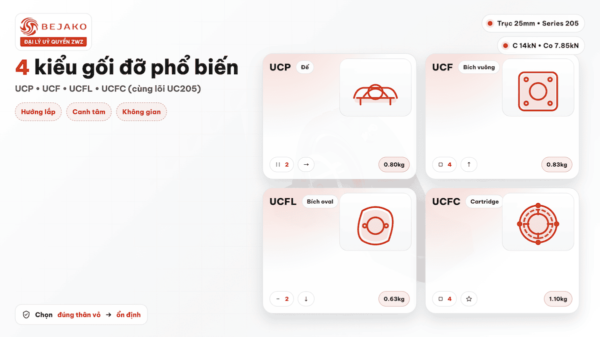 Dù đều sử dụng cùng một lõi vòng bi chèn UC205, mỗi dòng gối đỡ mang đặc điểm cấu tạo và ứng dụng khác nhau tùy vào hướng tải, diện tích lắp và yêu cầu canh chỉnh chính xác.