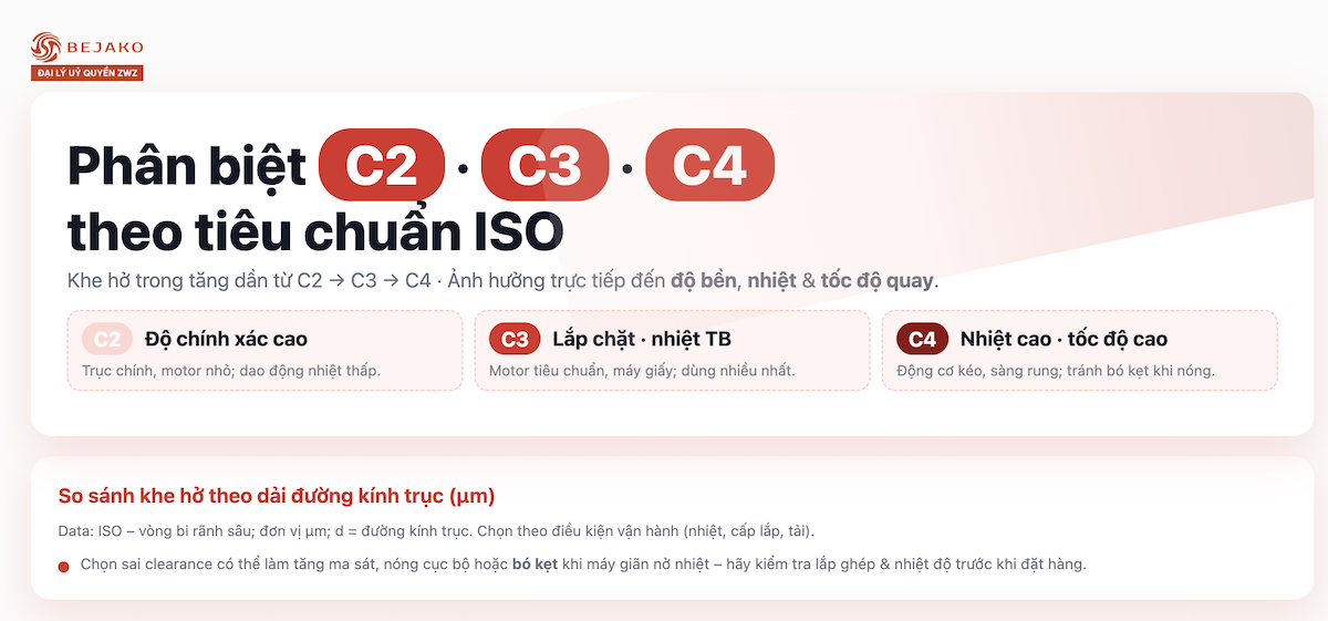 C2 nhỏ hơn tiêu chuẩn, phù hợp máy cần độ chính xác cao và nhiệt độ ổn định. C3, C4 có khe hở lớn hơn, dùng cho môi trường nhiệt cao, tốc độ cao hoặc tải trọng lớn để tránh bó kẹt vòng bi.